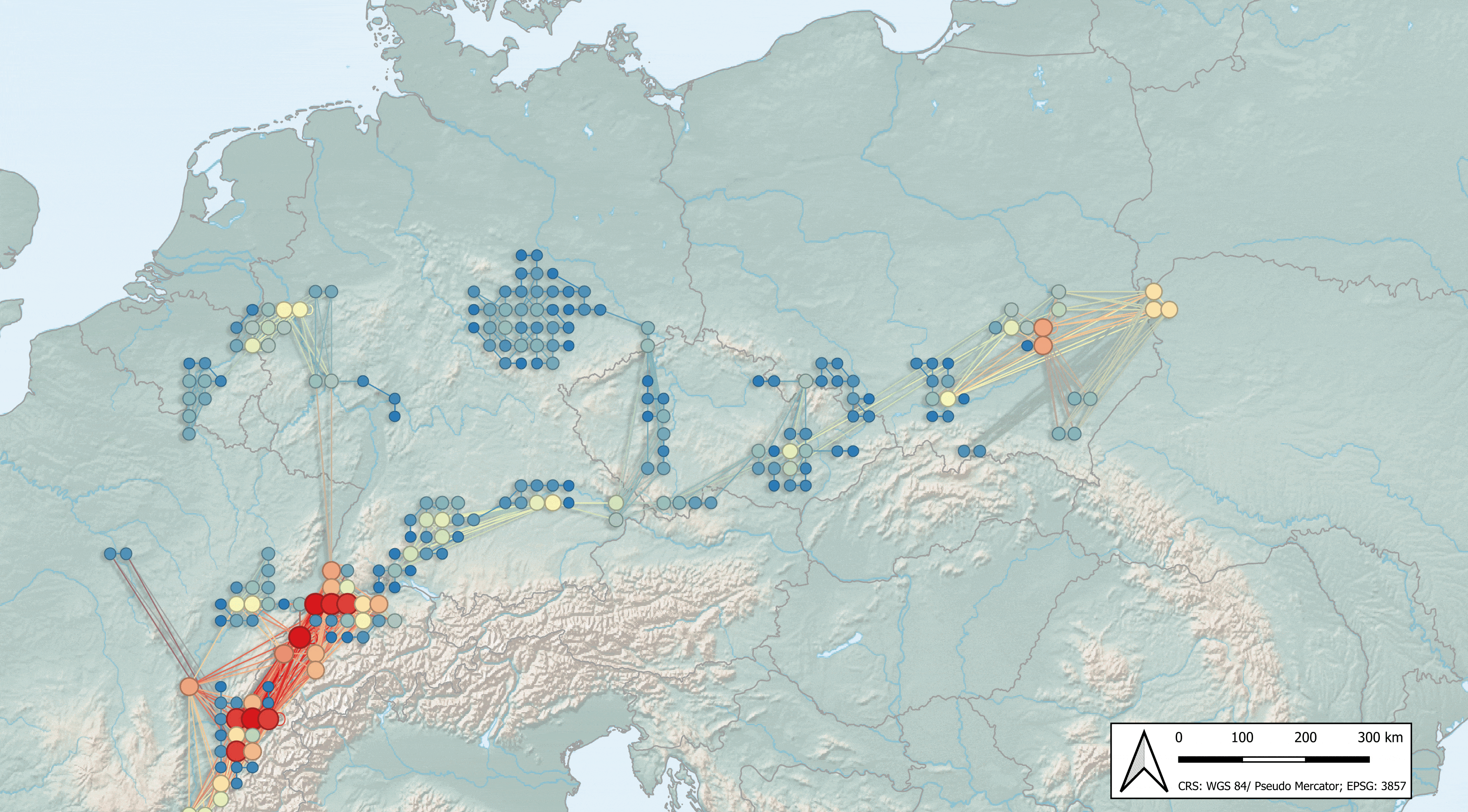 To analyse these connections, the research team develops network models that translate archaeological information into visual and analytical forms. These networks highlight potential connections between groups, such as clusters of sites or long-distance links, that can be related to mobility and migration. Rather than assuming one model of migration, this approach allows researchers to explore any potential possible pathways and relationships. In order to obtain an even better picture of movements, information on “effective distances” will later be included in the formation of the networks. These describe not only how far places are from each other as the crow flies, but also how people were actually able to move between them based on the topography (see).