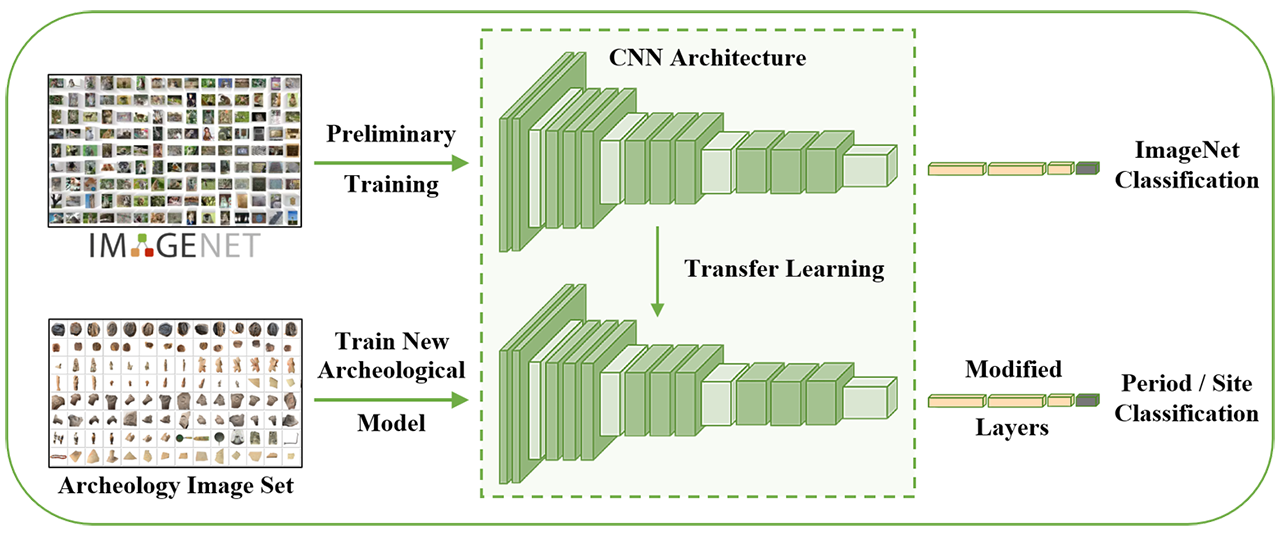 Modern transfer learning techniques based on convolutional neural networks (CNNs) offer an effective solution. As illustrated in the figure, these models first learn general image features from huge collections like ImageNet, which contain millions of everyday photos. The knowledge gained from this initial training can then be “transferred” to smaller archaeological datasets. By reusing the network’s learned visual understanding, researchers can extract meaningful features automatically, without needing to define them manually. This approach often outperforms human-crafted feature extraction, especially when data are limited.